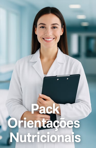 O pack de Orientações Nutricionais contemplam orientações com foco em pacientes hospitalares e ambulatoriais adultos. Você receberá o PDF e link editável no Canva.